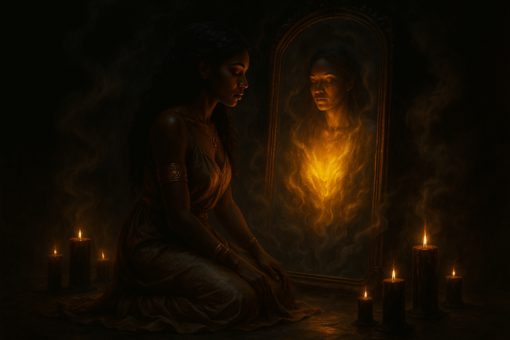 When I began my shadow work, I lit a single black candle and sat before the mirror. I looked into my own eyes until the reflection began to breathe with me.