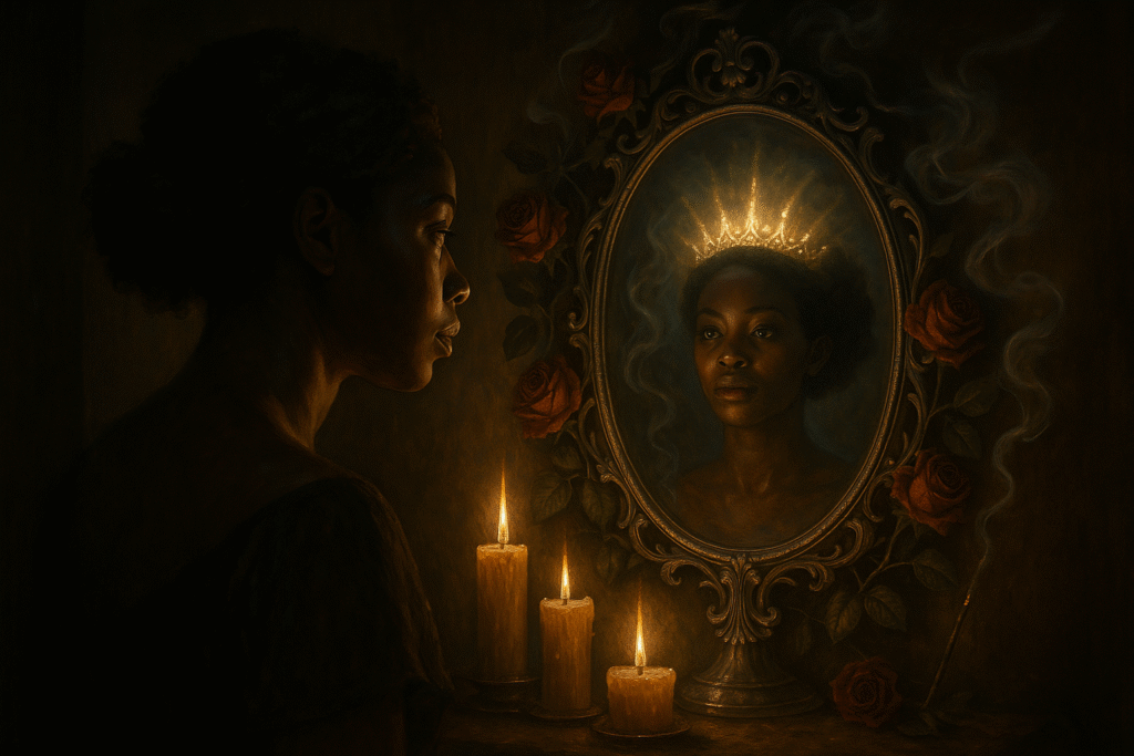 Each morning or night, I approach my mirror as an altar. I light two candles — one black, one white — for balance. Between them, I place a single rose, a token of self-devotion.